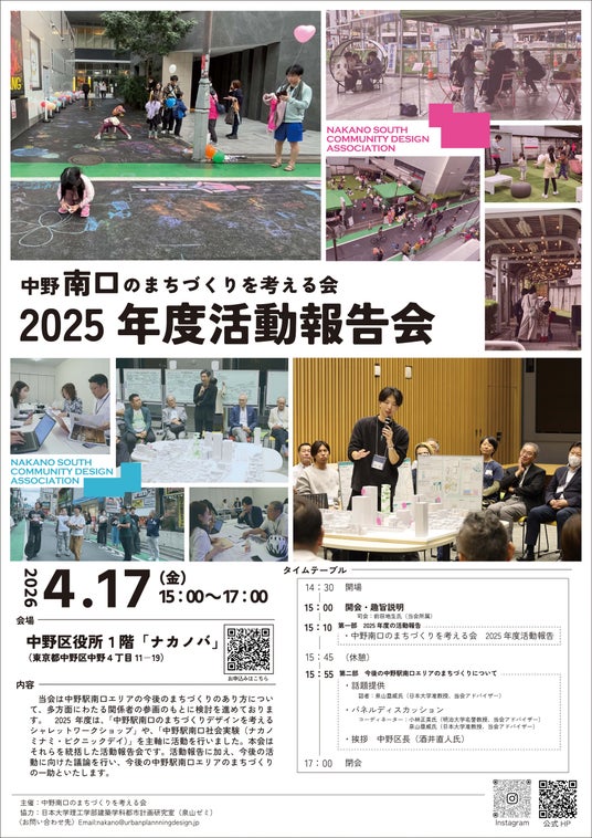 中野南口のまちづくりを考える会は、1年間の歩みを地域のみなさんと共有するため、2026年4月17日(金)15:00~17:00 に、中野区役所 屋内イベントスペース「ナカノバ」にて「中野南口のまちづくりを考える会 2025年度活動報告会」を開催します。2025年度は、「中野駅南口のまちづくりデザインを考えるシャレットワークショップ」や「中野駅南口社会実験(ナカノミナミ・ピクニックデイ)」を主軸に活動を行いました。