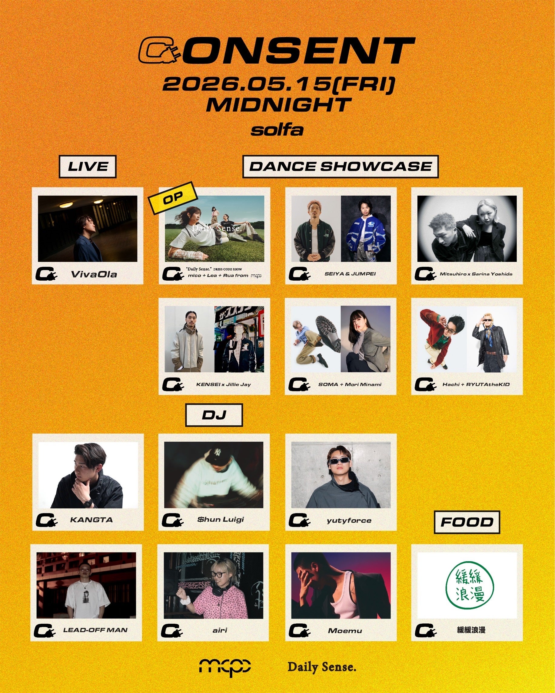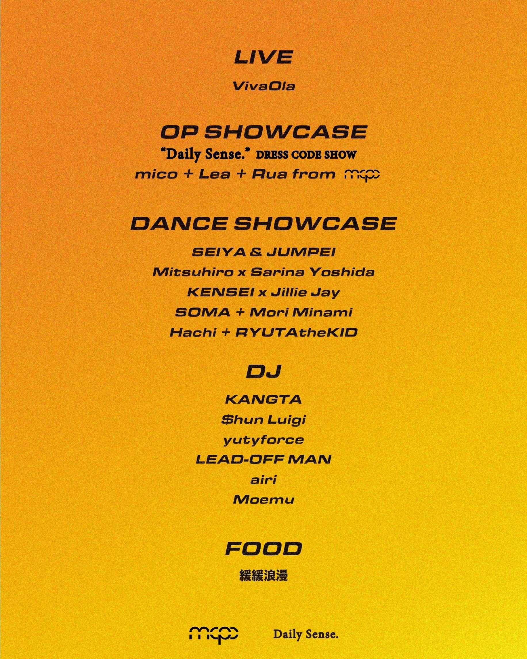 本イベントは、mcpcのアーティストフォトやタイトルデザインなどを手がけるクリエイティブプロジェクトDaily Sense.とのタッグにより実現。ダンサーをメインターゲットに据えながらも、音楽・ファッション・フードといった多様なカルチャーを横断し、東京のユースカルチャーの一端を担う新たな場の創出を目指す。
