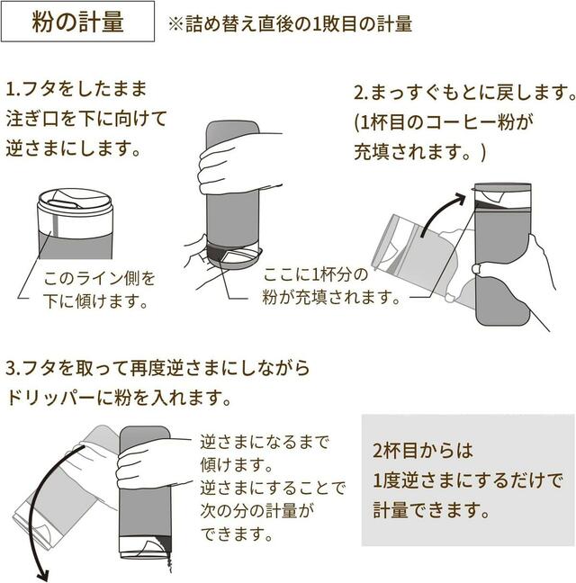 使い方は簡単で、本体をさかさまにした後に向きを元に戻すだけ。注ぎ口の下のスペースに1杯分が移動します。