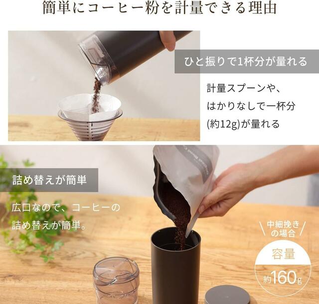 口が広いため、袋からの詰め替えがスムーズ。中細挽きの場合は約160gも保存が可能です。