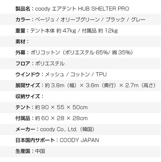 合同会社COODYは、新型エアテント「coodyエアテントHub Shelter Pro」(ハブシェルタープロ)を