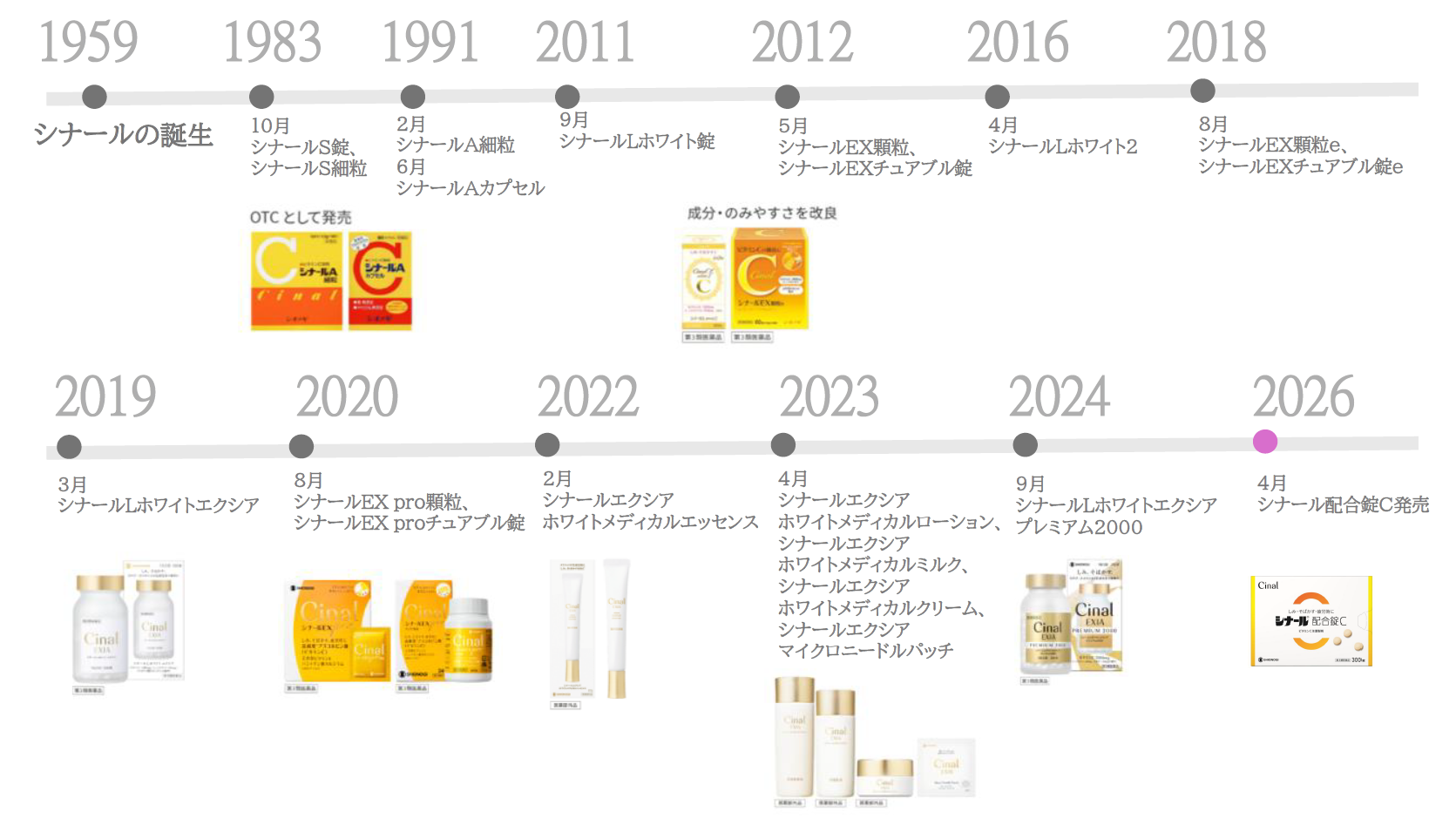 シナールは1959年にビタミンC医薬品として誕生して以来、市販薬としてもより身近にご活用いただけるよう、60年以上、成分や使いやすさにこだわった改良をつづけています。