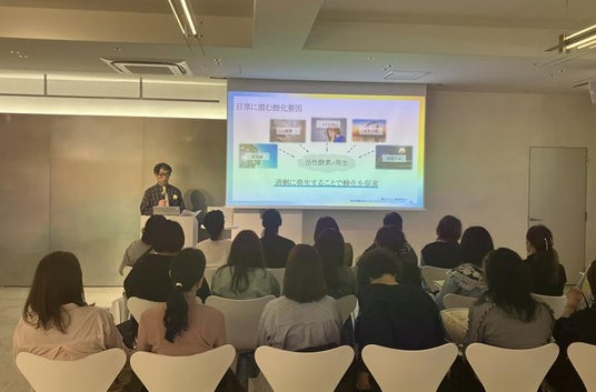 発表会では、製品保証本部 開発・調達戦略部 開発薬事/薬制グループ友田宜孝より、シオノギヘルスケアの会社紹介やシナールの歴史、新製品の詳細について説明いたしました。