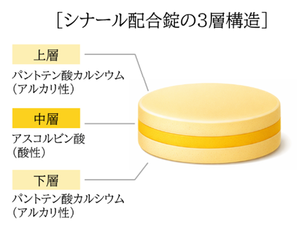 シナール配合錠Cは、アスコルビン酸をサンドイッチするようにパントテン酸カルシウムを上下層に配した三層構造を採用。