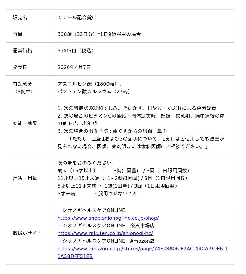ヘルスケア価値の提供を通じて社会に貢献するシオノギヘルスケア株式会社(本社:大阪府大阪市、代表取締役社長:中川 ゆう子、以下「シオノギヘルスケア」)は、医療用と同量の有効成分を配合*した「シナール配合錠C」(第3類医薬品)を 本日4月 7 日よりオンライン限定で発売いたします。(https://www.shop.shionogi-hc.co.jp/shop/)*医療用医薬品と同じ有効成分を同量配合(1錠中)