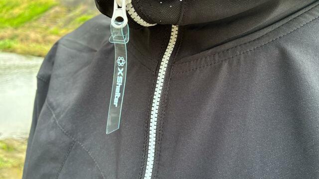 見た目は怪しさ満点ですが……。上までぴったり閉めなくても、ファスナーの範囲が広いため首やフェイスラインをしっかりガードしてくれます。