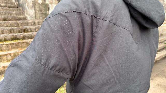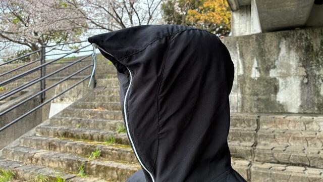 また、頭上まで閉じられるフードはドットメッシュ素材で、視界を確保しつつ完全防備も可能。