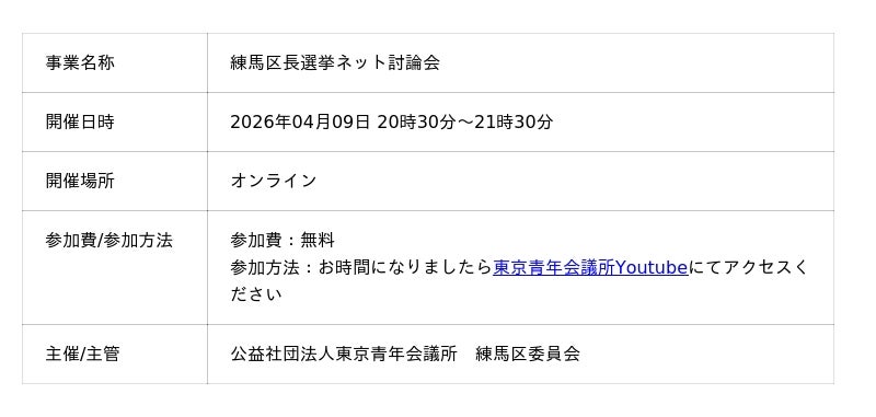 練馬区長選挙にあたり、有権者の皆さまが候補者の政策や理念を正しく理解し、主体的な一票を投じるための機会として、オンライン公開討論会を開催いたします。本討論会では、練馬区が抱える課題や将来のビジョンについて、候補者の声をインターネットを通じて直接お届けします。場所や時間の制約を超え、より多くの方に政治を身近に感じていただくことを目的としています。練馬の未来を考える第一歩として、ぜひご視聴ください。