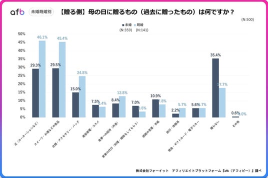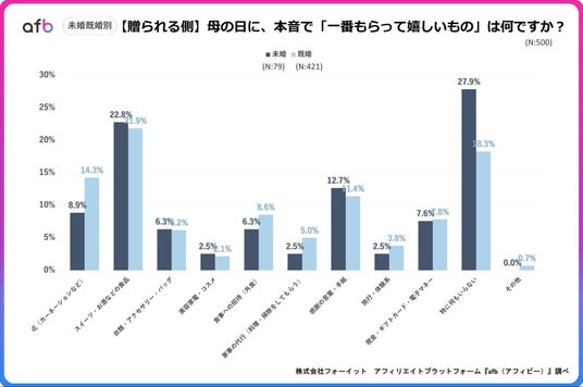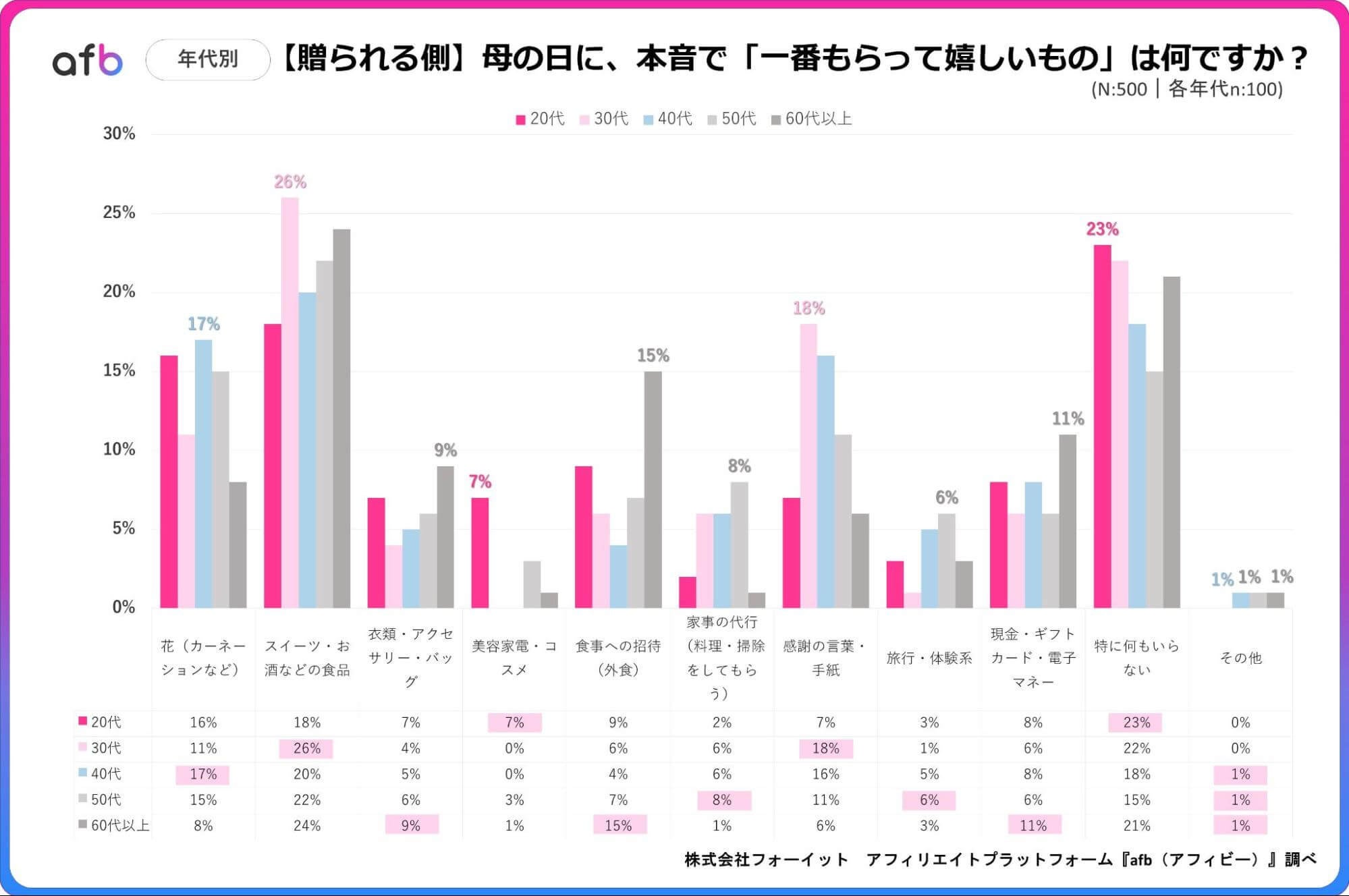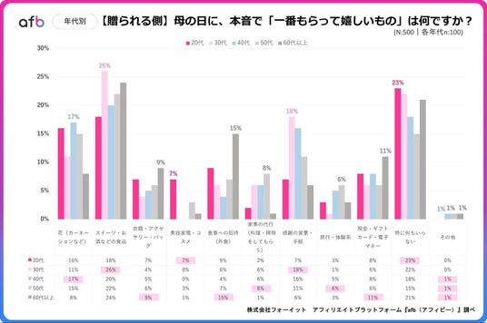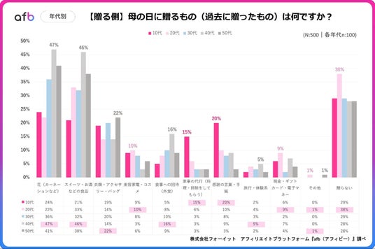 アフィリエイトプラットフォーム「afb(アフィビー)」< https://www.afi-b.com/ >の開発運用をおこなう株式会社フォーイットは、全国の20代~60代までの500人を対象に母の日についてのアンケートを実施し、年代別等の特徴についてまとめました。