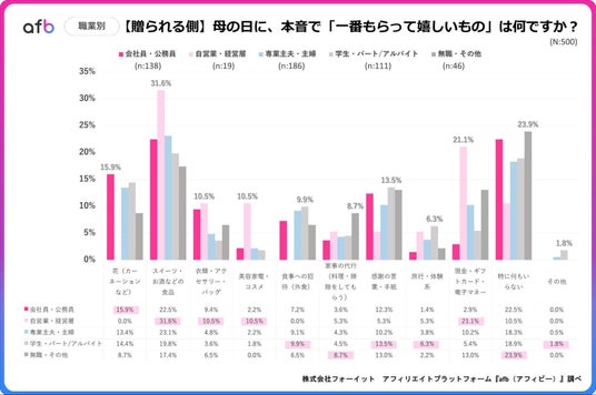 職業別に見ると、母の日に贈るものや嬉しいと感じるものは、収入や生活スタイル、時間の使い方によって大きく左右されていることが分かります。会社員・公務員では「花」や「スイーツ」といった定番ギフトの割合が高く、安定した収入と生活リズムの中で無難な選択がされている傾向が見られます。一方で、自営業・経営層では「スイーツ」や「体験型ギフト」の割合が高く、比較的自由度の高い選択がされている傾向があります。また、経済的制約が大きいと考えられる学生やパート・アルバイト層では「価格帯の低いギフト」や「贈らない」の割合が高く、特に無職層では「贈らない」が突出しており、収入の有無が行動に直結していることがわかります。贈られる側では、専業主婦・主夫層において「家事の代行」や「現金・ギフトカード」の割合が高く、日常生活に直接役立つ価値が重視されているようです。また、会社員層でも「現金・ギフトカード」や「体験型」のニーズが一定数見られ、自由度や実用性が評価されていることがうかがえました。