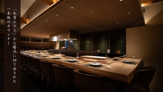 レストランの象徴となるのは、店内中央に設えられた全長8.51メートルのセンターカウンターです。空間の核として圧倒的な存在感を放つこのカウンターは、料理人の所作を間近に感じながら食事を楽しむ特別な舞台となります。