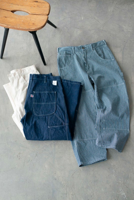 ワーク由来の意匠を随所に採用テキサス州にあるワークパンツブランドが生産を手がけたペインターパンツ。ナチュラル、デニム、ヒッコリーストライプの3色をラインナップします。ダブルニーとよばれる膝の補強パッチ、工具などを入れるための細長いポケット、金槌を掛けるためのハンマーループなど、ワークウェアならではの意匠が随所に。ゆったりとしたワイドシルエットも特徴ですが、ジャケットにもマッチするバランスに設定。