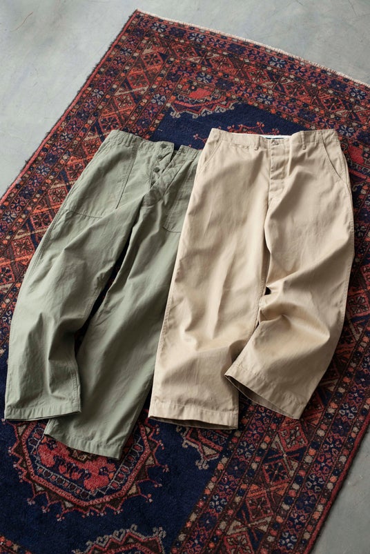 ヴィンテージの意匠を現代に継承どちらもヴィンテージのアメリカンミリタリーにインスピレーションを得てデザイン。左は1950年代をイメージしたベイカーパンツで、当時一般的だったサイドアジャスターボタンひとつの仕様を採用しています。右は1940年代のミリタリーチノがモチーフ。ワイドなシルエットに加え、ウエストベルトが一体化した作りや片玉縁仕上げのヒップポケット、斜めに切り込ませたサイドポケットなどが特徴です。