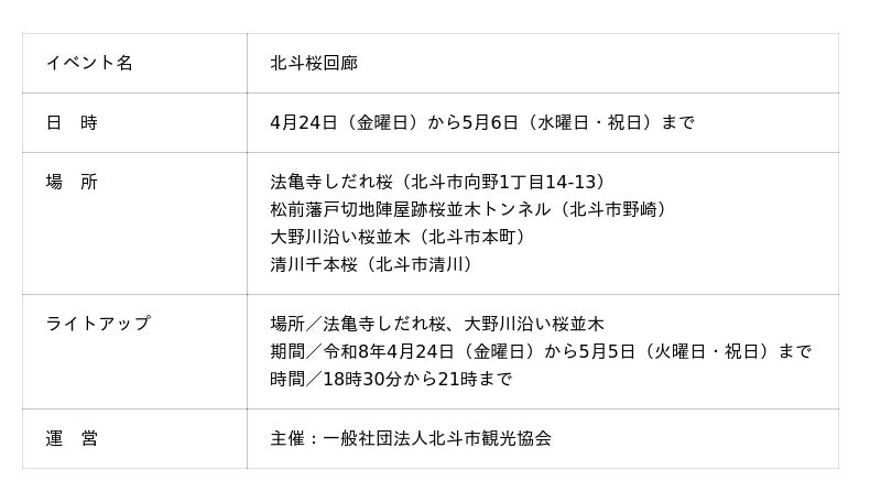 北海道北斗市では、一般社団法人北斗市観光協会が主催する「北斗桜回廊」を、4月24日(金)から5月6日(水)まで開催いたします。