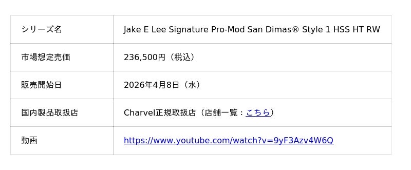 フェンダー ミュージカル インストゥルメンツ コーポレーション(所在地:米国カリフォルニア州、CEO:エドワード・バド・コール、以下FMIC)は、Charvelより伝説的ギタリスト、ジェイク・E・リーとのコラボレーションモデル『Jake E Lee Signature Pro-Mod San Dimas(R) Style 1 HSS HT RW』を発表しました。本モデルは、Ozzy Osbourneの『Bark at the Moon』および『The Ultimate Sin』時代に彼のサウンドを象徴したUSA製シグネイチャーモデルにインスパイアされており、その爆発的なトーンの多様性を、より手の届きやすい価格帯で実現しています。