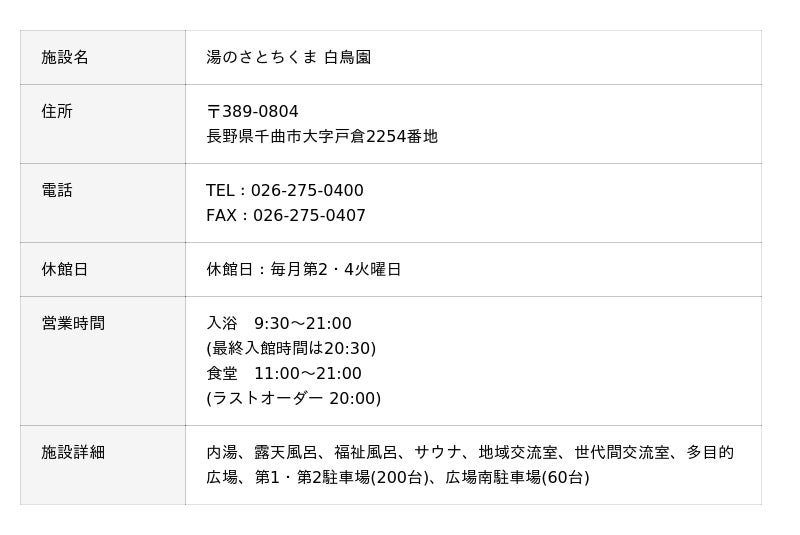 互恵株式会社(本社:長野県長野市東和田857-1/代表取締役:徳安 素一郎)は、長野県千曲市にある温浴施設「白鳥園」の指定管理者として選定され、2026年4月1日より施設運営を開始いたしました。(指定管理期間は5年間) なお、営業開始は2026年4月11日(土)です。