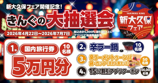 全国で365店舗を展開する『焼肉きんぐ』は、「新大久保フェア」の開催を記念して、2026年4月22日(水)より豪華賞品が当たる「きんぐの大抽選会」を実施いたします。