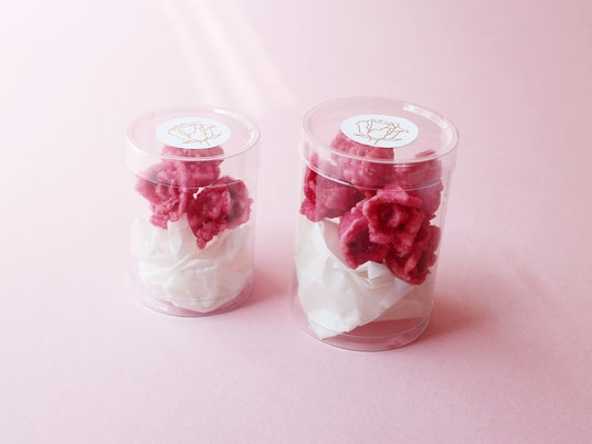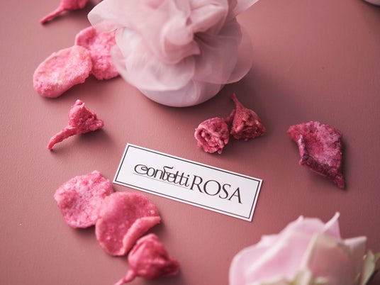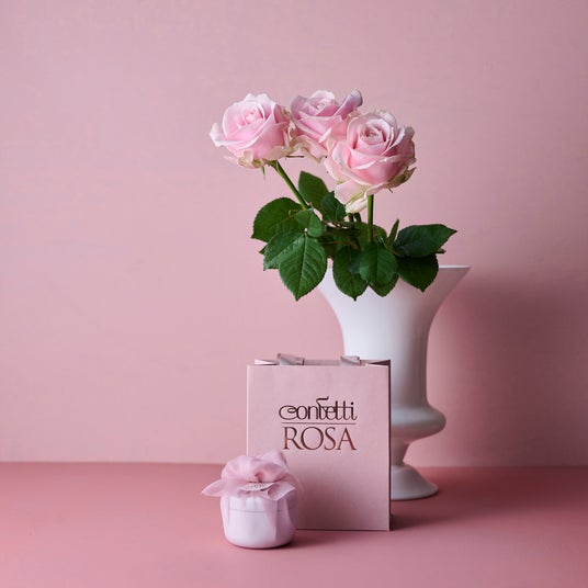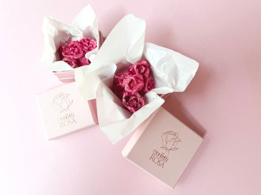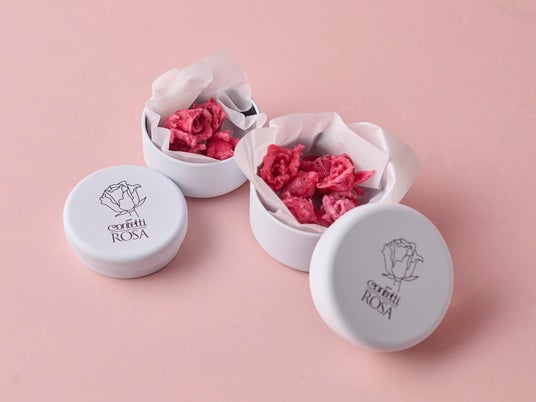 Confetti ROSAの薔薇の砂糖菓子Confetti ROSAの薔薇の砂糖菓子は、欧州で200年以上受け継がれている伝統製法のもと、約60日をかけて一輪のミニ薔薇を砂糖の結晶で包みます。高品質の天然素材のみを使用し、常温でも半年間、美しさと風味を保つ品質を実現しました。繊細な花の形をそのまま閉じ込めた、宝石のような佇まいも特徴です。