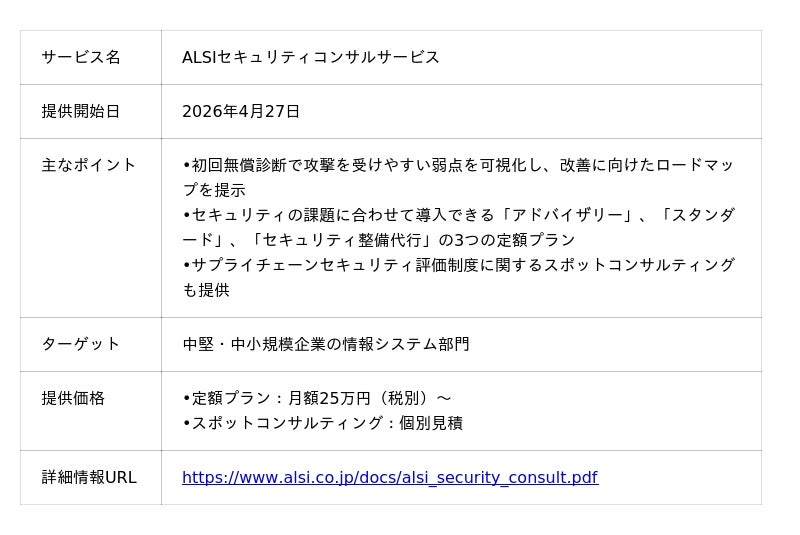 アルプス システム インテグレーション株式会社(本社:東京都大田区、代表取締役社長:金子 央、以下ALSI〔アルシー〕)は、セキュリティの課題に合わせて、現状把握から改善、セキュリティ製品・サービス導入後の運用支援までを提供する「ALSIセキュリティコンサルサービス」を2026年4月27日から提供開始いたします。