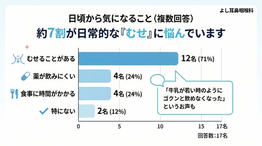 セミナー終了後に実施した参加者アンケート(回答数17名)では、地域住民が抱える「のど」に関する切実な悩みが浮き彫りになりました。日頃から気になることとして、全体の約7割にあたる12名が「むせることがある」と回答しています。さらに「食事に時間がかかる」(4名)、「牛乳が若いときのようにゴクンと飲めなくなった」といったリアルな声も寄せられました。