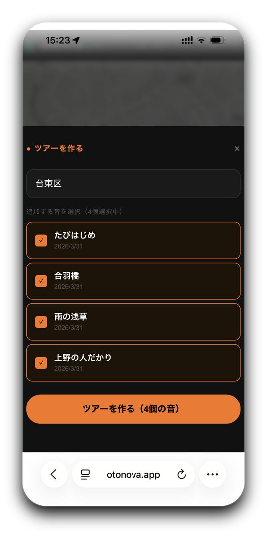 スマートフォンのブラウザからアクセスするだけで、その場で録音した7秒の音声を現在地に保存できます。旅の思い出や街の風景を音で残し、ツアーとしてまとめてシェアする新しい体験を提供します。