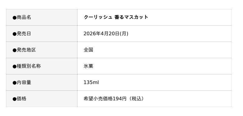株式会社ロッテ(東京都新宿区、代表取締役社長執行役員:中島英樹)は4月20日(月)に、“飲むアイス”の「クーリッシュ」ブランドから、『クーリッシュ 香るマスカット』を発売します。「まあ、スカッとしようぜ!」をキャッチコピーに、新生活のちょっとしたモヤモヤに、春らしいポジティブで爽やかな美味しさを提供していきたいという想いで開発しました。「香り」が特徴であるマスカット・オブ・アレキサンドリア果汁を20%使用し、商品を仕立てています。また、芳醇な果実を頬張ったようなジューシーな味わいを再現するため、使用するマスカット果汁には「アロマカットバック製法」を採用。濃縮工程で失われる香りを事前に回収して果汁に戻すことで、豊かな風味を引き出しました。これからの季節にピッタリな、気持ちをスカッとさせる美味しさをぜひお楽しみください。