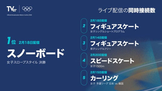 民放公式テレビ配信サービス「TVer(ティーバー)」における、ミラノ・コルティナオリンピック(TM)コンテンツの総再生数が2,550万再生を記録した北京オリンピック(TM)を大きく上回る4,400万再生(※1)を突破しました。