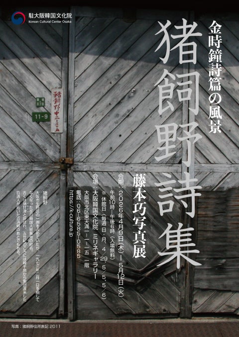 駐大阪韓国文化院(院長 金蕙穗;キム・ヘス)は、4月9日(木)から5月12日(火)まで、『金時鐘詩篇の風景、藤本巧写真展「猪飼野詩集」』を同院1階のミリネギャラリーにて開催いたします。