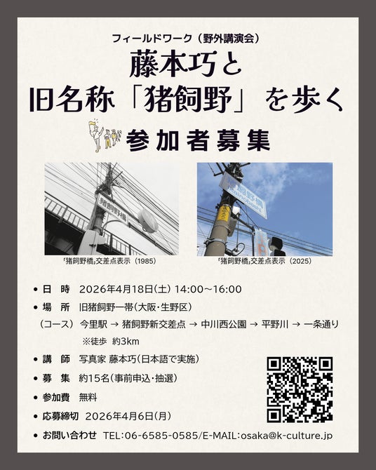 続いて4月18日には、藤本巧氏と共に旧・猪飼野地域を実際に散策するフィールドワーク『藤本巧と旧地名「猪飼野」を歩く』を実施いたします。本プログラムは、地図から失われた地名「猪飼野」の痕跡をたどり、その地に刻まれた歴史を現場で直接振り返るために企画されました。プログラムでは、写真の中の風景のみならず、今もなお変化し続けている猪飼野の姿を肌で感じていただけるでしょう。