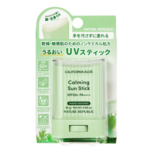 モイスチャーアロエUVスティックにはアロエベラ、CICA、ヨモギをトリプルブレンドしたネイチャーリパブリックの独自成分「マデカロエ(TM)」を配合しています。SPF50+/PA++++で紫外線から肌をガードすると同時に、うるおいを与えて肌荒れを防ぎます。さらに紫外線吸収剤不使用のマイルドな使い心地になっており、お子様や乾燥・敏感肌*にもお使いいただきやすいようこだわって開発しました。日差しを浴びてゆらぎやすくなった肌*¹をやさしく整え、うるおいで満たします。