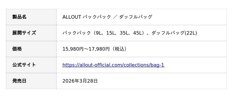 国内主要ECモールのトレーニングギア部門でシェアNo.1※1を獲得し、シリーズ累計販売数400万個を突破※2した「ALLOUT(オールアウト)」。トレーニングを知り尽くした同ブランドから、待望の新作バッグシリーズが販売開始となります。「ジム用と仕事用のバッグを分けるのが面倒」「荷物の中で汗をかいた靴とPCが混ざるのが嫌だ」といったユーザーのリアルな悩みを根本から解決。プロ視点の設計で、仕事からトレーニングまでの移動を圧倒的に快適にするプロダクトを完成させました。
