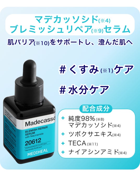 純度98%(※8)マデカッソシド(※4)・ツボクサエキス(※4)・TECA(※11)・ナイアシンアミド(※4) が、くすみ(※1)肌をケアし、すこやかで透明感(※2)のある肌へ。