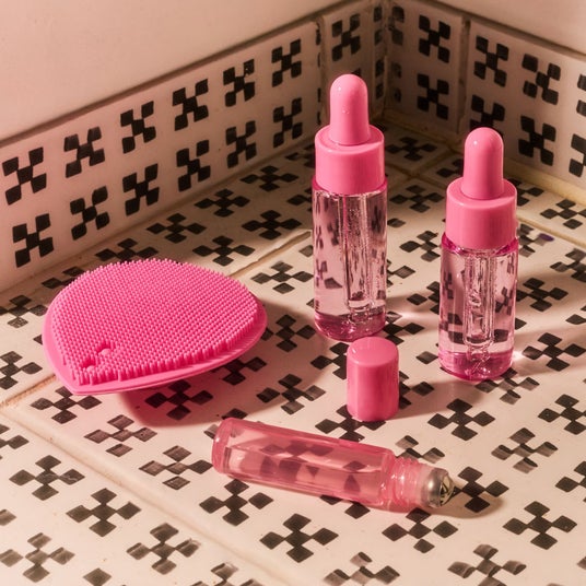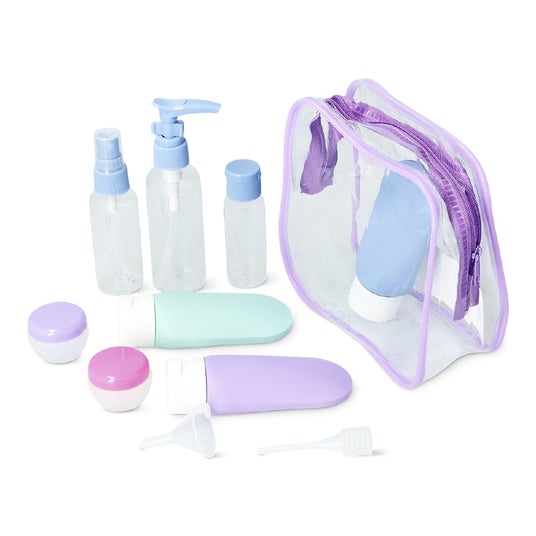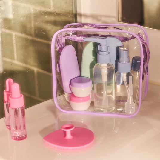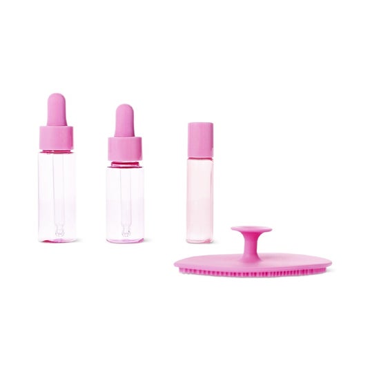ひと目でわかるから、使いやすい。美容液やヘアオイルの携帯に便利なトラベルセット。付属のシリコンブラシは、やさしく洗顔ができます。