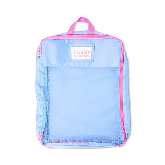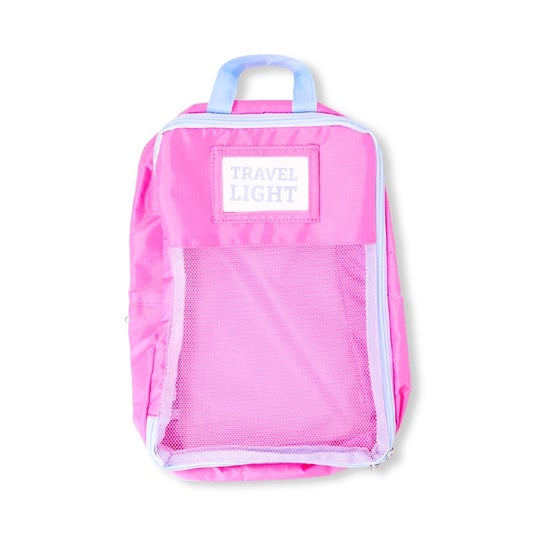 洋服を入れてファスナーを閉めるだけで、手軽に圧縮できるバッグ。カラフルなピンクとブルーのデザインもポイント。TシャツなどはSサイズ、かさばるものはLサイズがおすすめです。