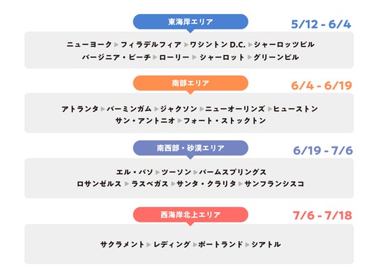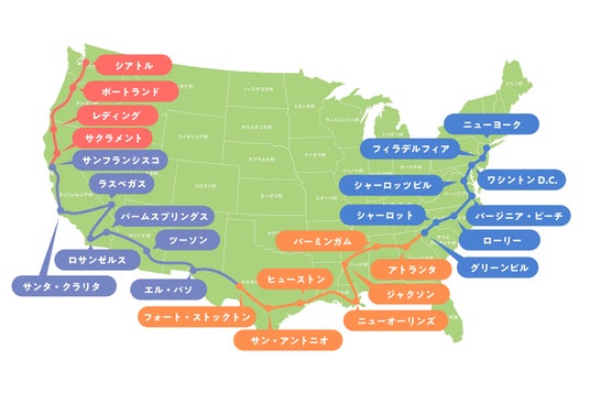 ニューヨークからシアトルまで26の市を滞在ルート