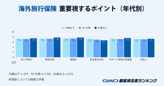 下グラフは、利用者が海外旅行保険を選ぶ際に各項目をどの程度重視するかを年代別に示したものです。全体では「保険料」(7.5点)や「商品内容」(7.4点)が特に重視されており、コストと補償内容のバランスが選定の主な軸になっていることがわかります。年代別に見ると、60歳以上では「商品内容」(7.8点)や「保険料」(7.8点)、「サポート体制の充実度」(7.6点)をより重視する傾向が見られました。一方、29歳以下では「担当者の対応」(7.3点)を60歳以上(6.7点)より高く重視しており、若い世代ほど担当者の対応への期待が大きいことがうかがえます。