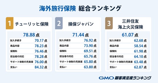 GMOインターネットグループのGMOリサーチ&AI株式会社(代表取締役社長:荻田 剛大)は、同社が運営する「GMO顧客満足度ランキング」における「海外旅行保険」(※1)カテゴリのランキング結果を2026年4月8日(水)に公開しました。利用者が本当に満足しているサービスを明らかにする、海外旅行保険の総合ランキングで、チューリッヒ保険が1位に輝きました。