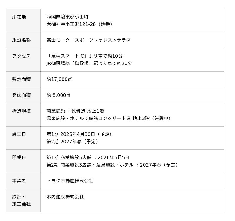 本施設は、2社が静岡県駿東郡小山町で協働して推進する再開発計画「富士モータースポーツフォレストプロジェクト」の一環として、トヨタ不動産が開発・運営します。「富士モータースポーツフォレスト」は、国際サーキット「富士スピードウェイ」を中心とした、モータースポーツや様々なモビリティ体験を楽しめる複合施設で、エリア全体が「新しい体験」や「発見」のある場所へと常に進化を続けています。