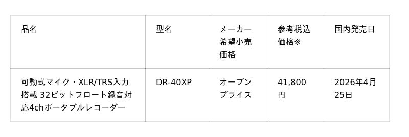 TASCAM(タスカム)は、32ビットフロート録音対応4chポータブルレコーダー『DR-40XP』を2026年4月に全世界に向けて出荷を開始いたします。