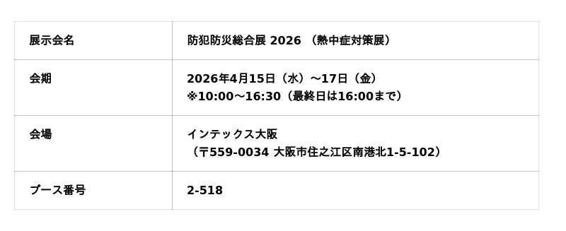 本製品は、2026年4月15日(水)・16日(木)・17日(金)にインテックス大阪で開催される「防犯防災総合展 2026(熱中症対策展)」(ブースNo.2-518)に出展致します。