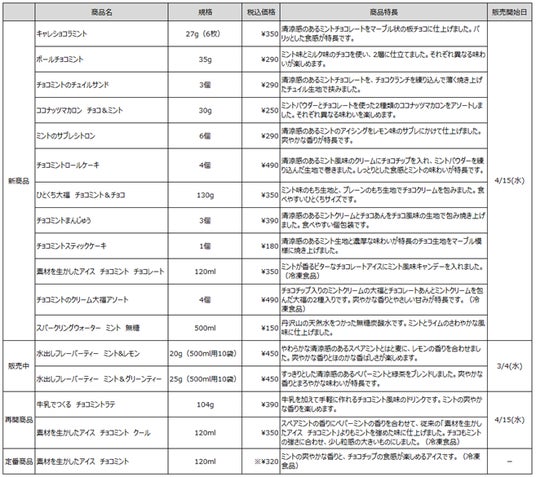 ※1 先行発売商品:「ボールチョコミント」、「キャレショコラミント」、「ココナッツマカロン チョコ&ミント」、「素材を生かしたアイス チョコミント チョコレート」、「素材を生かしたアイス チョコミント クール」、「チョコミントのクリーム大福アソート」、「牛乳でつくる チョコミントラテ」