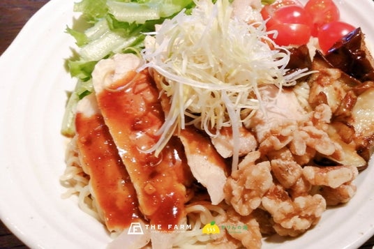 館内の「ザファーム食堂」今月のおすすめは、「花椒香る よだれ鶏混ぜそば」。 しっとりとした水郷佐原銘柄鶏の胸肉に、花椒が効いたタレを合わせた“香り立つ一杯”で、サウナ後のサ飯にもぴったりです。 そのほか、釜飯や四川料理“麻辣湯”などのメニューもご用意しています。