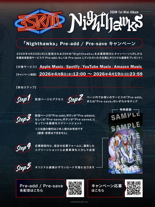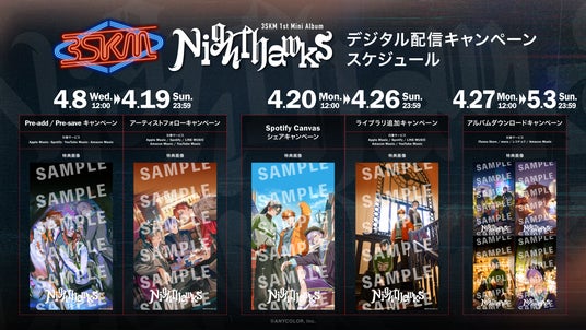 2026年4月29日(水)にCD発売される、3SKM 1st Mini Album「Nighthawks」が、2026年4月20日(月)にデジタル先行配信されることが決定しました!