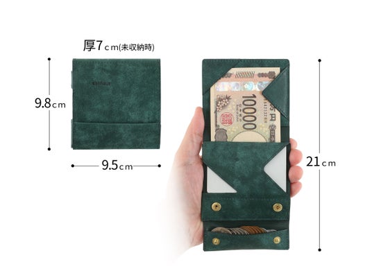 本モデルでも、未収納時約7mm、最大収納時でも約13mmという薄さと、約40gの軽さを継承。お札を折らずに収納できる構造に加え、視認性の高いコインポケットと取り出しやすいカードケースを搭載。ミニマルでありながら、日常使いに十分な収納力を確保しています。