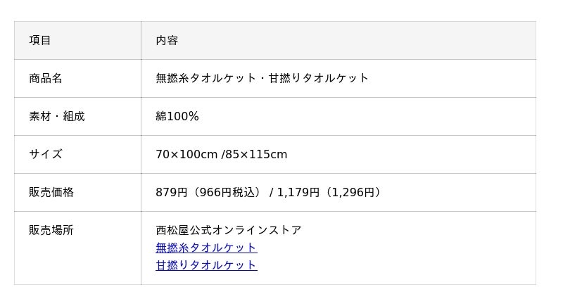 株式会社西松屋チェーン(兵庫県姫路市、代表取締役社長:大村浩一)は、「無撚糸(むねんし)タオルケット」と「甘撚(あまよ)りタオルケット」を、全国の西松屋店舗および公式オンラインストアにて販売しております。お子さまの成長に寄り添い、毎日を心地よく過ごしていただきたいという思いから、「やさしさ」と「機能性」、そして「お手頃な価格」を追求しました。