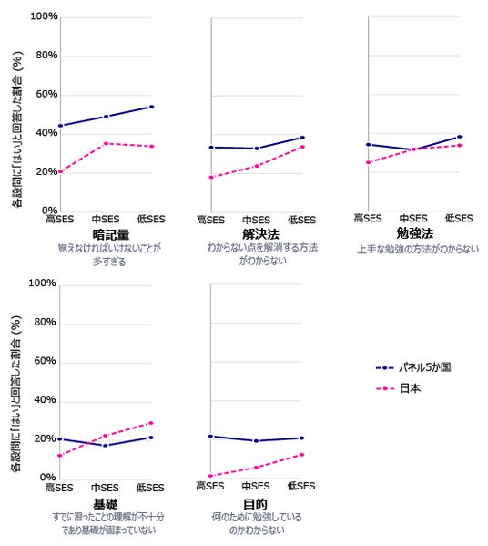 一方の日本では、SESが高い層と低い層で肯定率の差が15%pt程度開く設問もあり、パネル5か国と比べて家庭の社会経済的背景が算数の勉強への課題感に影響している可能性が示されました。日本の特徴としては、高SES層における課題感の低さがあります。高SES層においては、いずれの設問においても課題があるという回答がパネル5か国を下回っています。特に「覚えなければいけないことが多すぎる」「何のために勉強しているのかわからない」と日本の高SES層が回答した割合は、パネル5か国の高SES層と比べて半分以下に抑えられています。これは、日本の高SES層において、算数を単なる暗記科目と捉えないような本質的な理解を促す経験や、算数の勉強と将来の目標の関連を意識する機会が得られている可能性を示唆しています。しかしその反面、日本の低SES層では依然として「覚えなければいけないことが多すぎる」「上手な勉強法がわからない」といった課題を持ったままになっている現状があります。