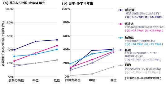 一方、日本(図2(b))においても、いずれの設問においても計算力高位よりも低位のほうが課題を感じている傾向にありました。さらに、パネル5か国と比べると計算力高位と低位での肯定率の差が大きい傾向がみられました。日本は、パネル5か国以上に計算力層が低い層ほど課題を感じている可能性があります。なお、計算力層による差が最も大きい課題は「覚えなければいけないことが多すぎる」(計算力低位-高位の肯定率が27.8%pt差)でした。日本においては、暗記量の負担感の克服が、計算力向上に重要であることが示唆されました。