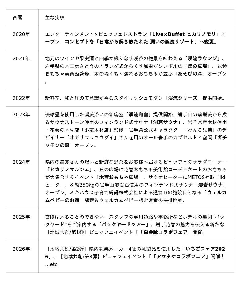 湯の杜 ホテル志戸平「日常からの解放」をコンセプトに、渓流リゾートホテルを通じた非日常への体験価値提供を行っている宿泊施設。2020年のビュッフェレストラン「Live×Buffet ヒカリノモリ」新設以降、様々な改装を重ね、お客様へ岩手花巻の魅力を伝えると共に感動提供にチャレンジしています。