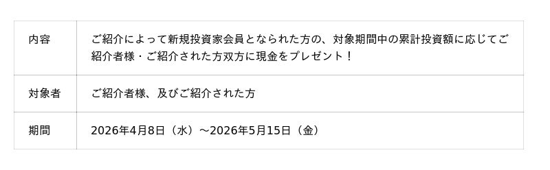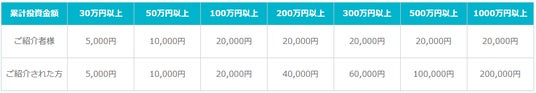 ※紹介者の方(既に投資家の方)ご自身の投資額は、プレゼント金額には関係ございません。