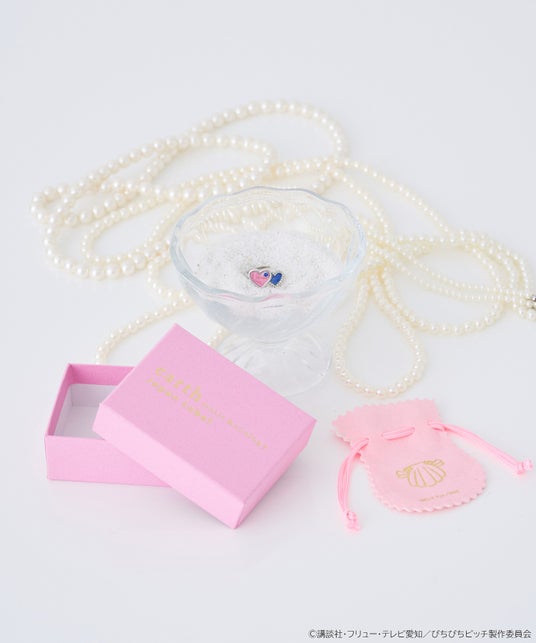 「海斗」が「るちあ」に贈った指輪のデザインをオマージュしました。ハート部分はガラス素材で海を連想させる透明感ある作りに仕上げました。サイズは調節可能なフリーサイズで、人魚の尾ひれがポイント。オリジナルボックス&巾着入りで、ワンランク上の特別なリングです。